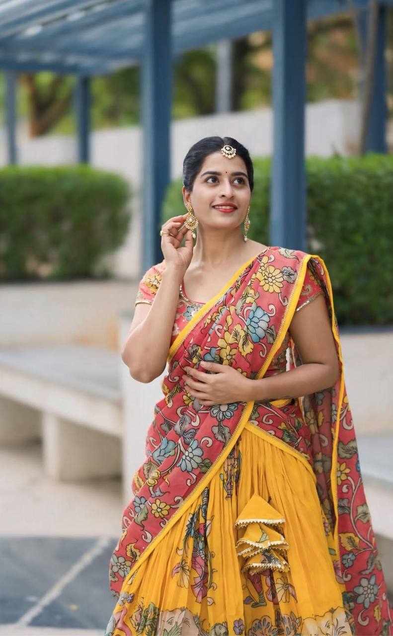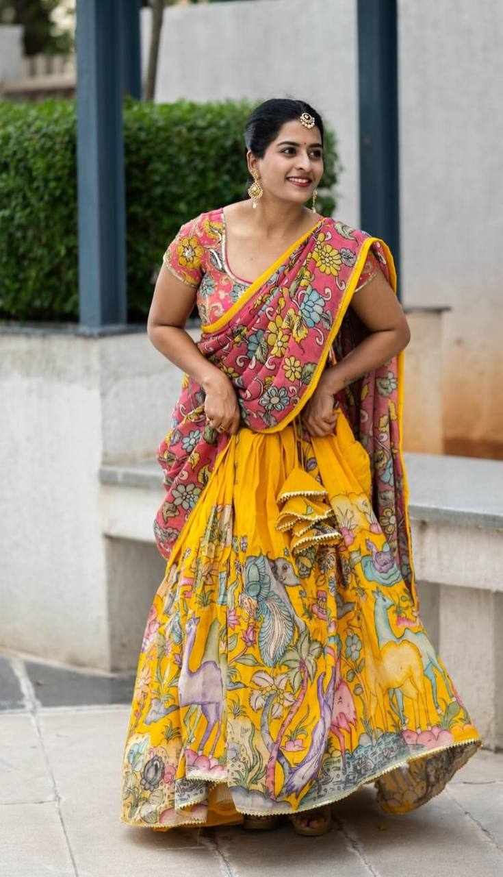 Step into ethnic elegance with the Kalamkari Lehenga in a vibrant yellow hueโa graceful ensemble for festivals, functions, or that perfect traditional day out. Crafted for comfort, styled for impact!
