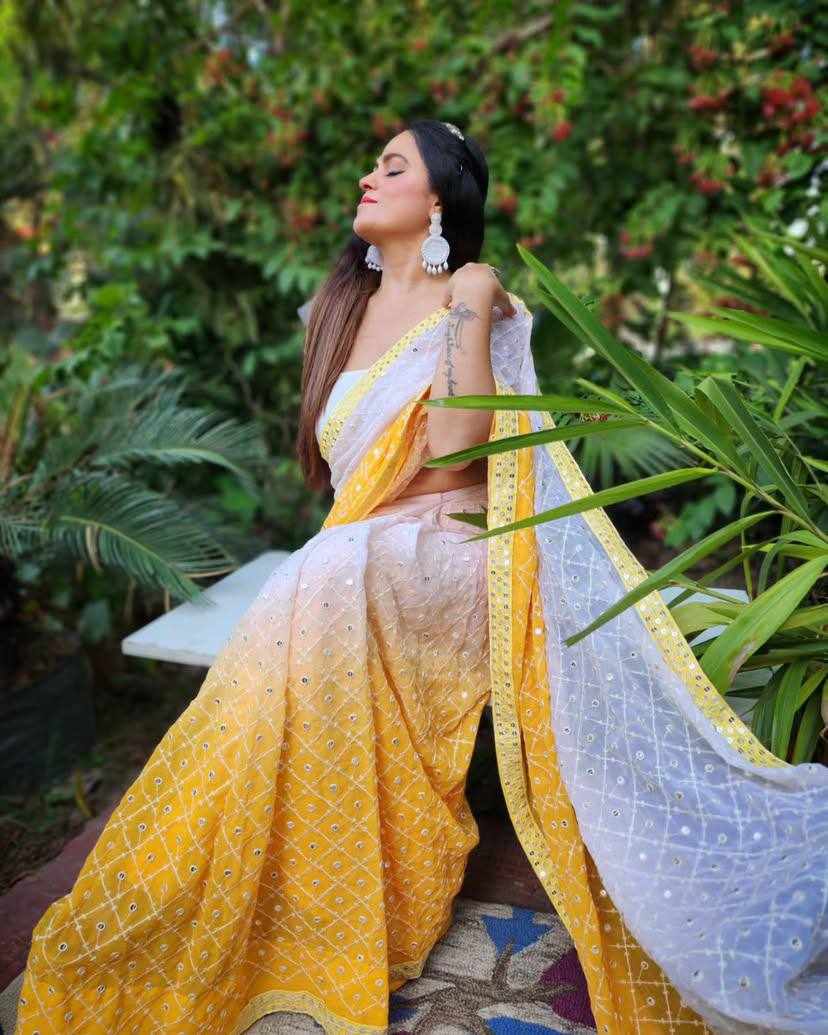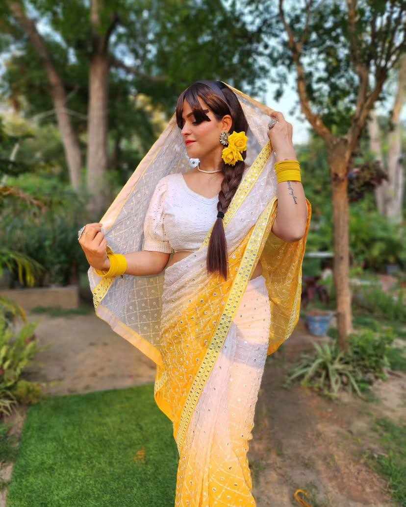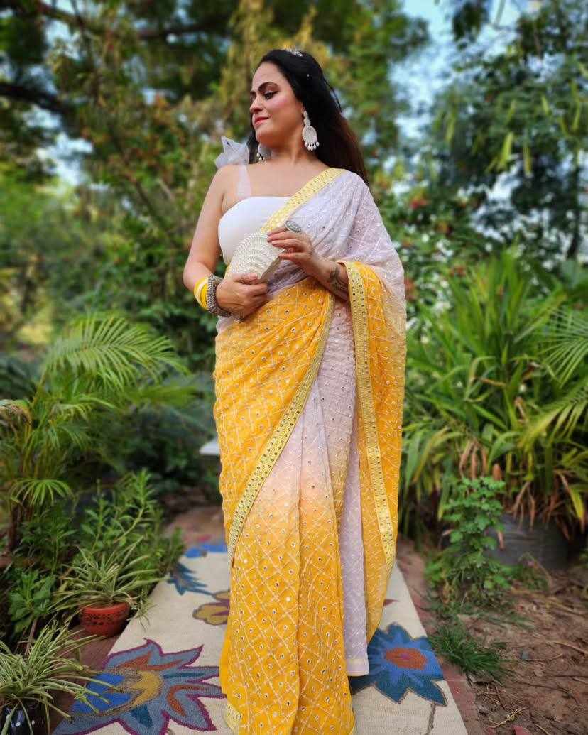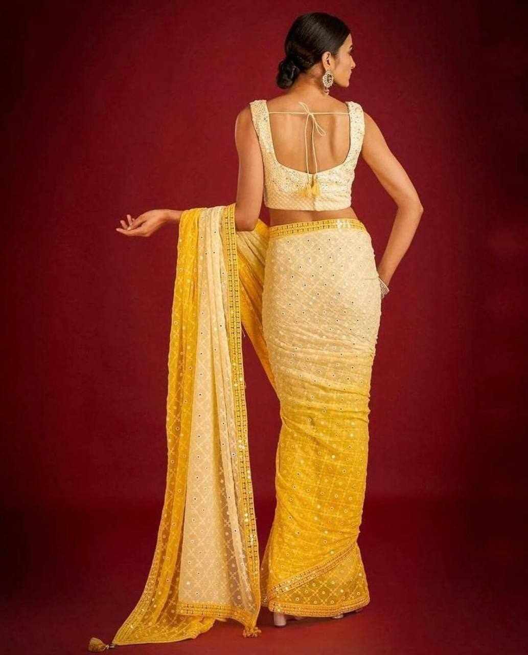 This saree blends modern shimmer with traditional detailing, making it a perfect choice for weddings, receptions, sangeet nights, or festive parties.